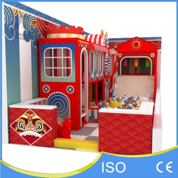 Embrace a unique cultural aesthetic with this “Guochao” (Chinese Chic) Lion Dance playground. Perfectly designed for compact spaces (30-50m²), it combines traditional Chinese design elements (like the Lion Head & auspicious clouds) with modern soft play, including a multi-level structure, slides, and a large ball pit. A stunning, high-end attraction for cultured venues. CE/ISO certified by Hanlin.