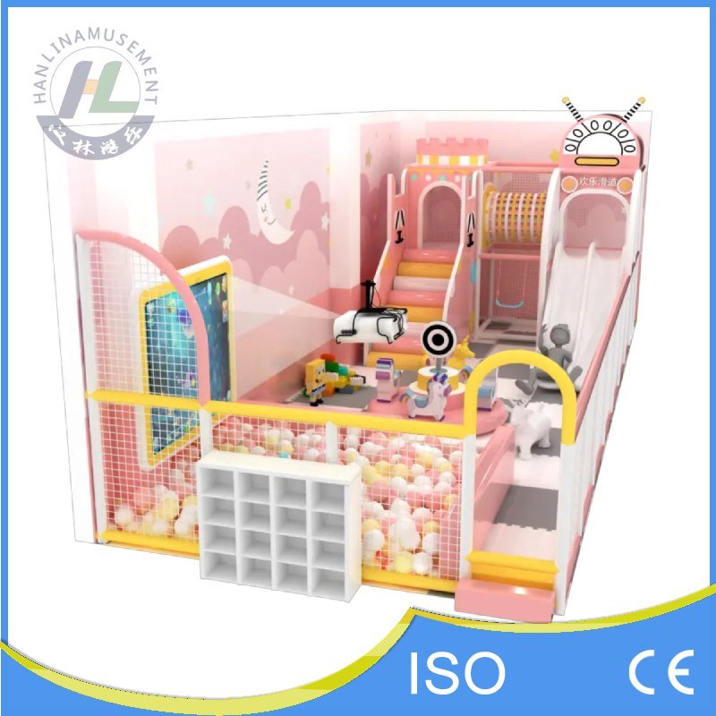 Combine digital fun with physical play! This “Dreamy Pink” playground is a high-tech solution for compact spaces (30-50m²). It features an interactive video game screen over the ball pit, a pink castle with slides, and a central activity zone. This high-ROI attraction is perfect for modern cafes, play centers, and retail stores. CE/ISO certified by Hanlin.