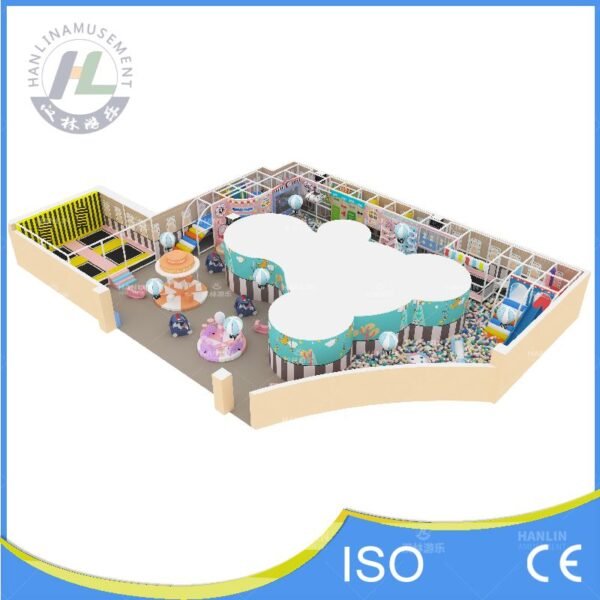 Set your family entertainment center apart with the Hanlin Macaron Sky Theme Indoor Playground. Moving away from traditional bright primary colors, this design utilizes a sophisticated Morandi pastel palette (soft blues, creams, and oranges) combined with whimsical “hot air balloon” and “cloud” motifs. This aesthetic is specifically calibrated to appeal to modern parents and serves as a perfect backdrop for social media sharing.