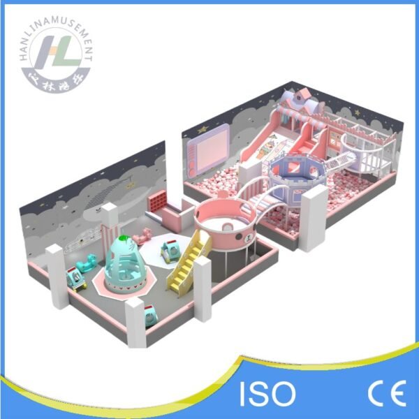 Differentiate your venue with the Hanlin Pastel Starry Night Indoor Playground. Moving away from loud, bright colors, this design uses a soothing palette of premium grey, white, and dusty pink. The background walls feature artistic moon and cloud illustrations, creating a cozy “bedtime story” atmosphere that appeals to modern parents and toddlers.